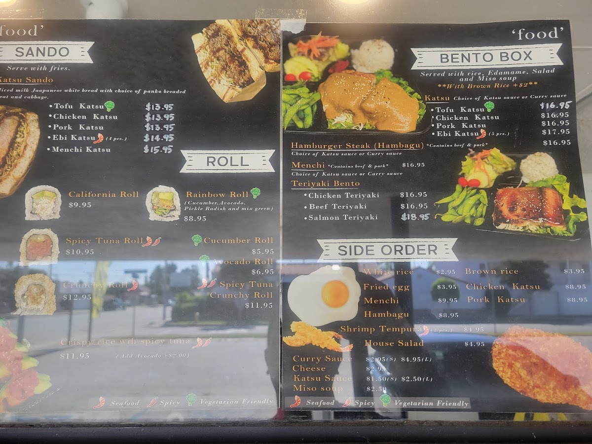 Sides provide complementary items including pork katsu, shrimp tempura, menchi (a beef and pork patty), miso soup, white and brown rice options, curry sauce, katsu sauce, fried egg, and house salad.