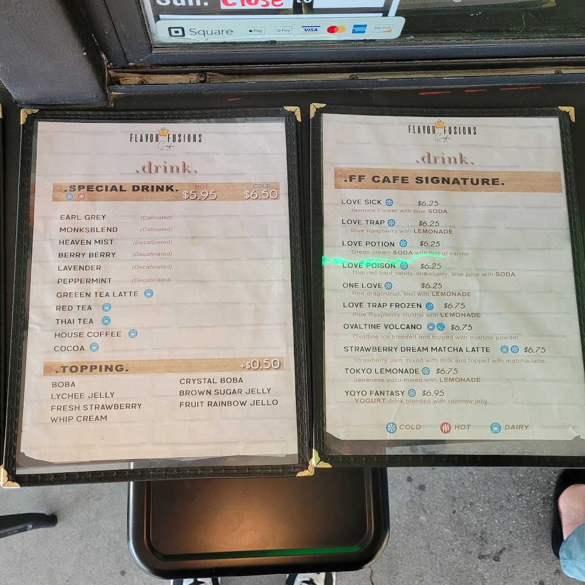 Beverages primarily include a variety of soft drinks with popular options such as green milk tea and Thai tea, catering to casual drink preferences alongside meals.